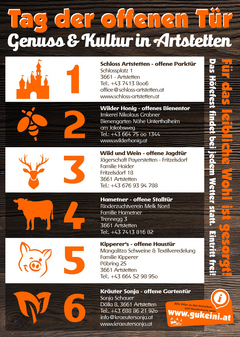 Nehmen Sie sich für den 28. April nichts anderes vor – ab 9 Uhr stehen die Tore und Türen der teilnehmenden Betriebe – die natürlich auch mit dem Auto erreichbar sind – offen. Das abwechslungsreiche Angebot der zum Teil prämierten Betriebe macht „Lust auf mehr“ und lädt ein, bald wiederzukehren oder ein „Stückchen Artstetten“ mit nach Hause zu nehmen.